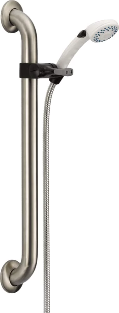 - Delta Adjustable Grab Bar features a 2-Setting Hand Shower that has a 60 to 82″ (152 to 208 cm) stretchable metal hose