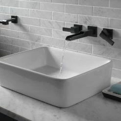 - With defined geometric angles and edges, the Delta Ara 2-Handle Wall Mount Bathroom Faucet with Channel Spout creates a streamlined look of contemporary elegance