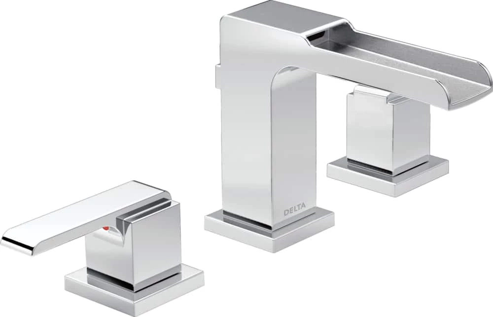 - With defined geometric angles and edges, the Delta Ara 2-Handle Wide Spread Bathroom Faucet with Channel Spout creates a streamlined look of contemporary elegance