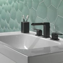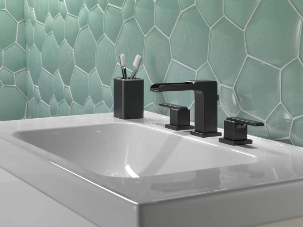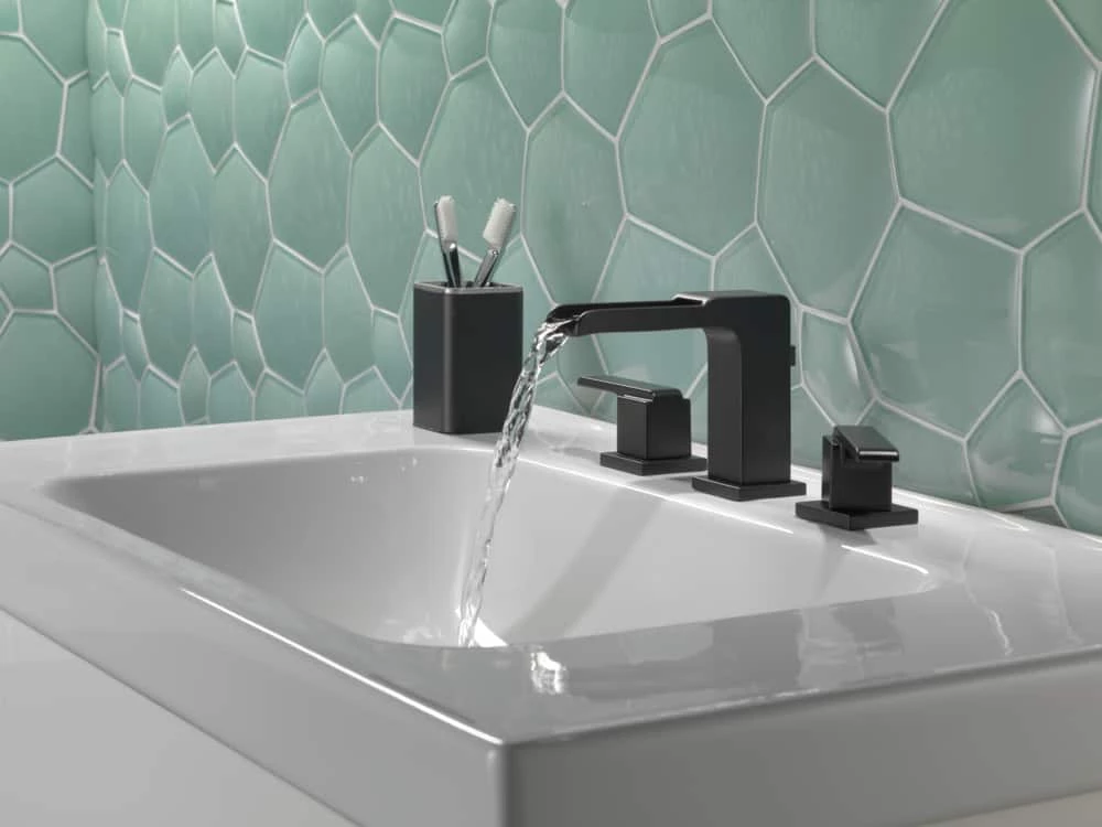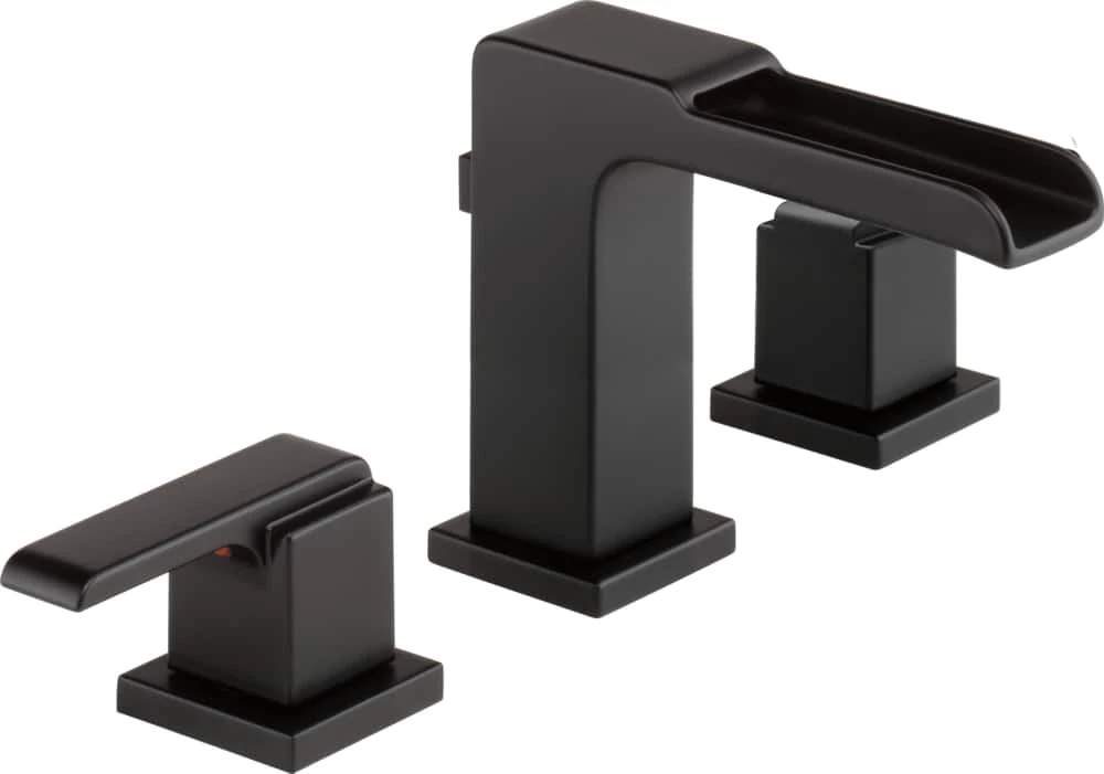 - With defined geometric angles and edges, the Delta Ara 2-Handle Wide Spread Bathroom Faucet with Channel Spout creates a streamlined look of contemporary elegance